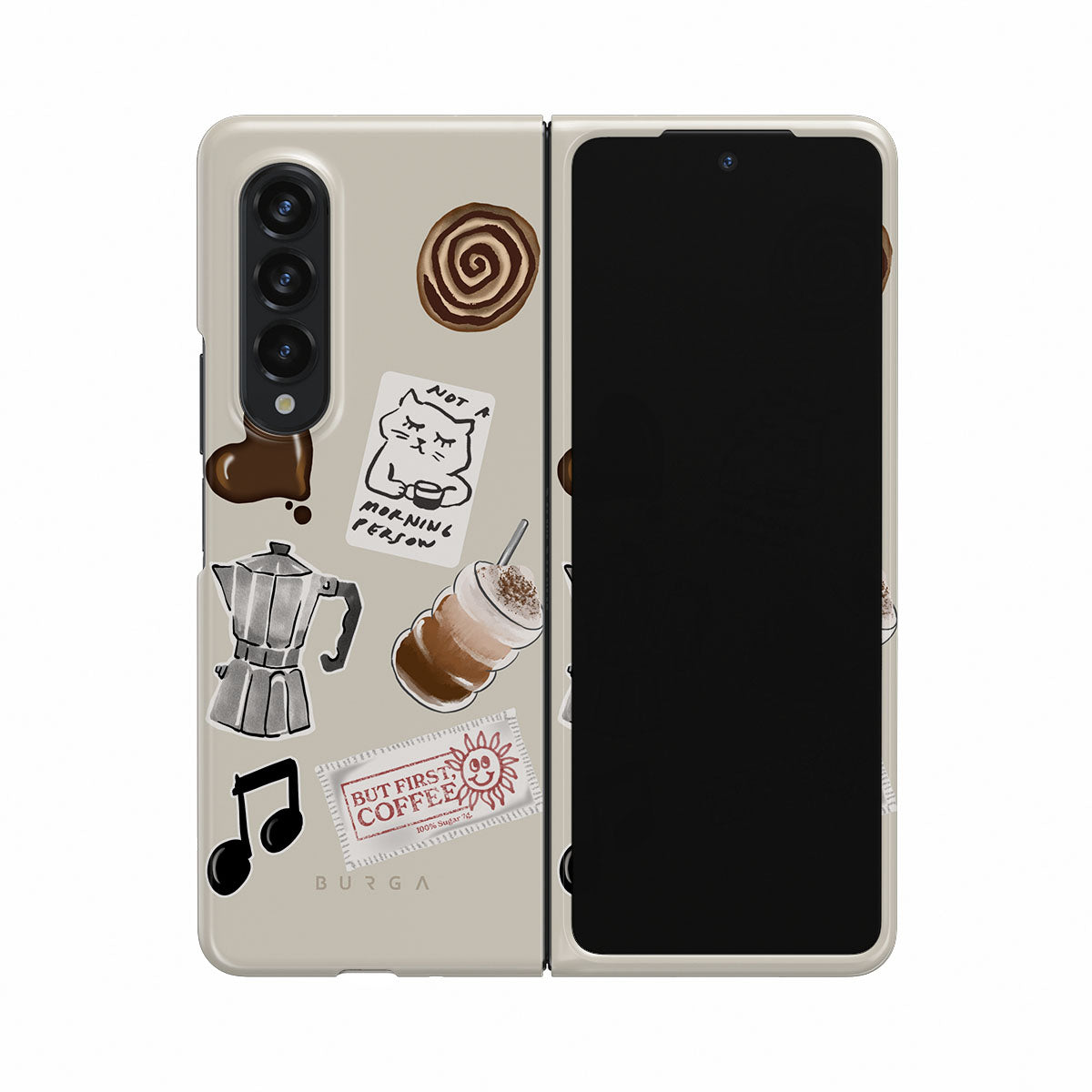Typické pro tento motiv: moka konvičku, frappé, skořicovou rolku, čokoládové srdce, samolepku „Not a morning person“, účtenku „But First, Coffee“, notu.