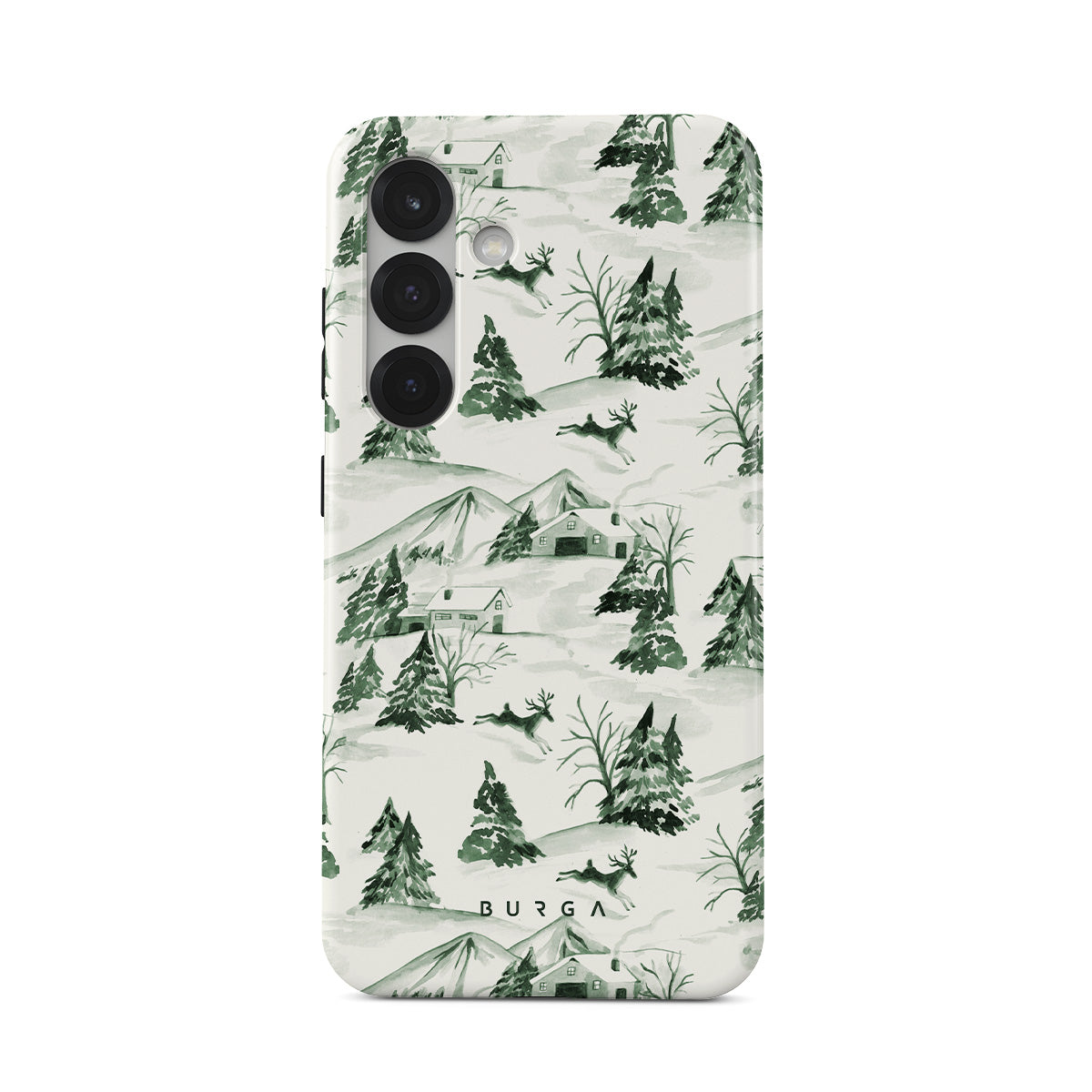 Typické pro tento motiv: zimní lesní scenérie, borovice, zasněžená krajina, zelená a bílá, přírodní vzor, lesní Vánoce, stálezelené stromy, vintage ilustrace