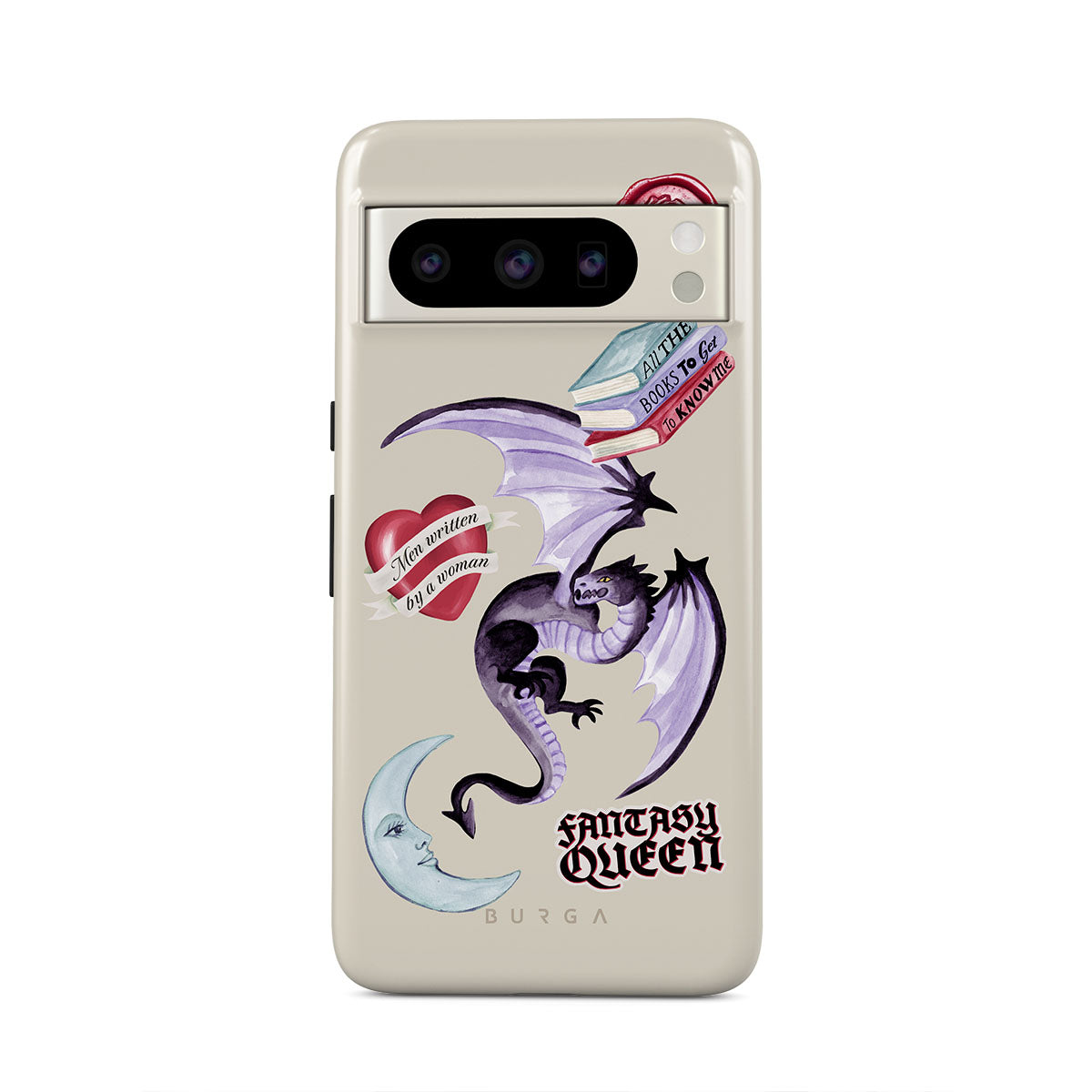 Typické pro tento motiv: fialového draka, samolepku „Fantasy Queen“, půlměsíc, fialovou pečeť, srdce se zprávou, knihy.