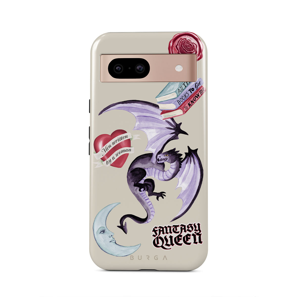 Typické pro tento motiv: fialového draka, samolepku „Fantasy Queen“, půlměsíc, fialovou pečeť, srdce se zprávou, knihy.