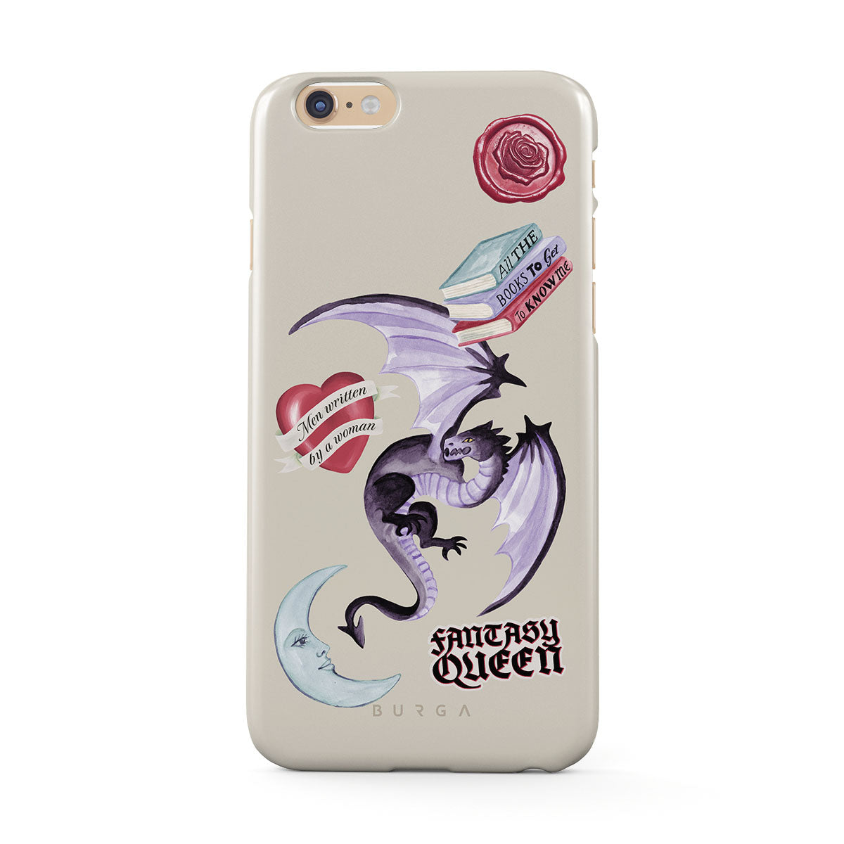 Typické pro tento motiv: fialového draka, samolepku „Fantasy Queen“, půlměsíc, fialovou pečeť, srdce se zprávou, knihy.