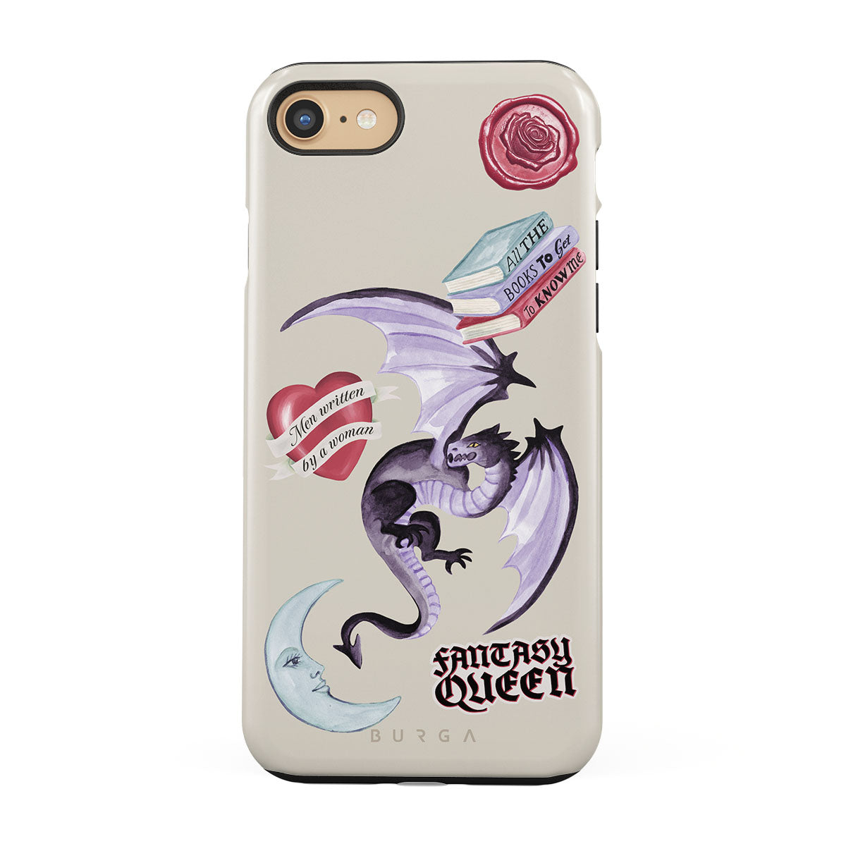 Typické pro tento motiv: fialového draka, samolepku „Fantasy Queen“, půlměsíc, fialovou pečeť, srdce se zprávou, knihy.