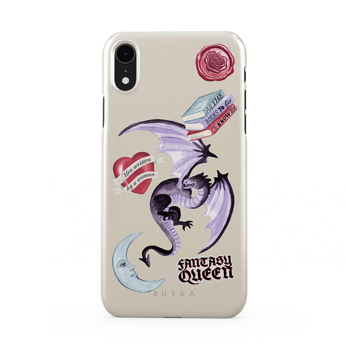 Typické pro tento motiv: fialového draka, samolepku „Fantasy Queen“, půlměsíc, fialovou pečeť, srdce se zprávou, knihy.