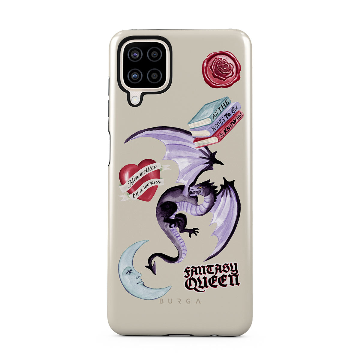 Typické pro tento motiv: fialového draka, samolepku „Fantasy Queen“, půlměsíc, fialovou pečeť, srdce se zprávou, knihy.