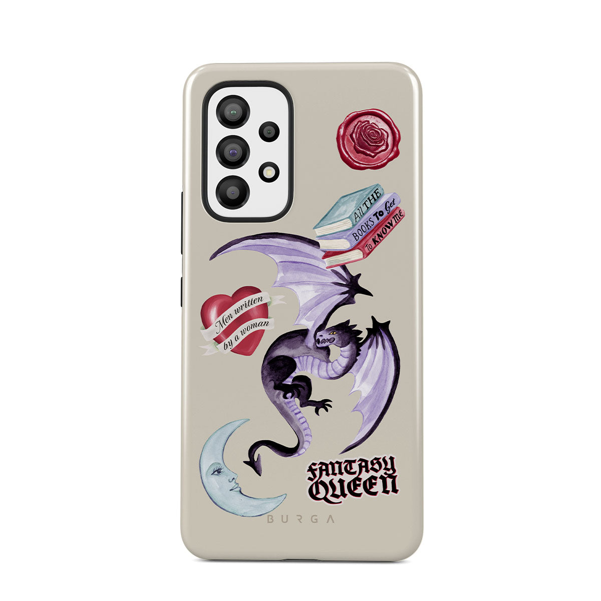 Typické pro tento motiv: fialového draka, samolepku „Fantasy Queen“, půlměsíc, fialovou pečeť, srdce se zprávou, knihy.