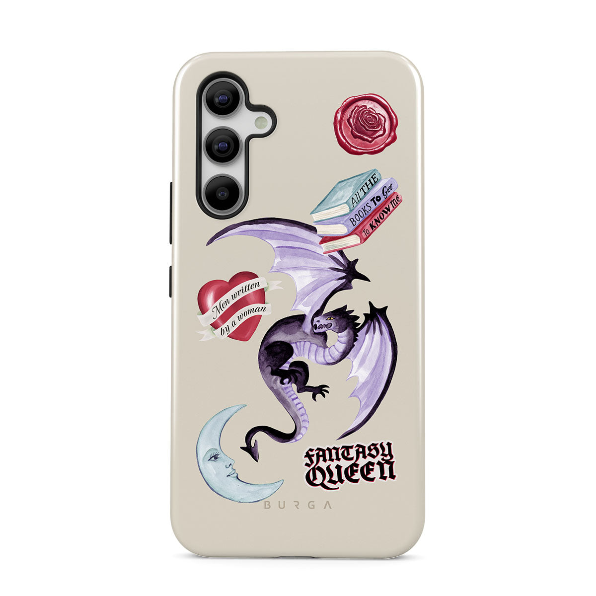 Typické pro tento motiv: fialového draka, samolepku „Fantasy Queen“, půlměsíc, fialovou pečeť, srdce se zprávou, knihy.
