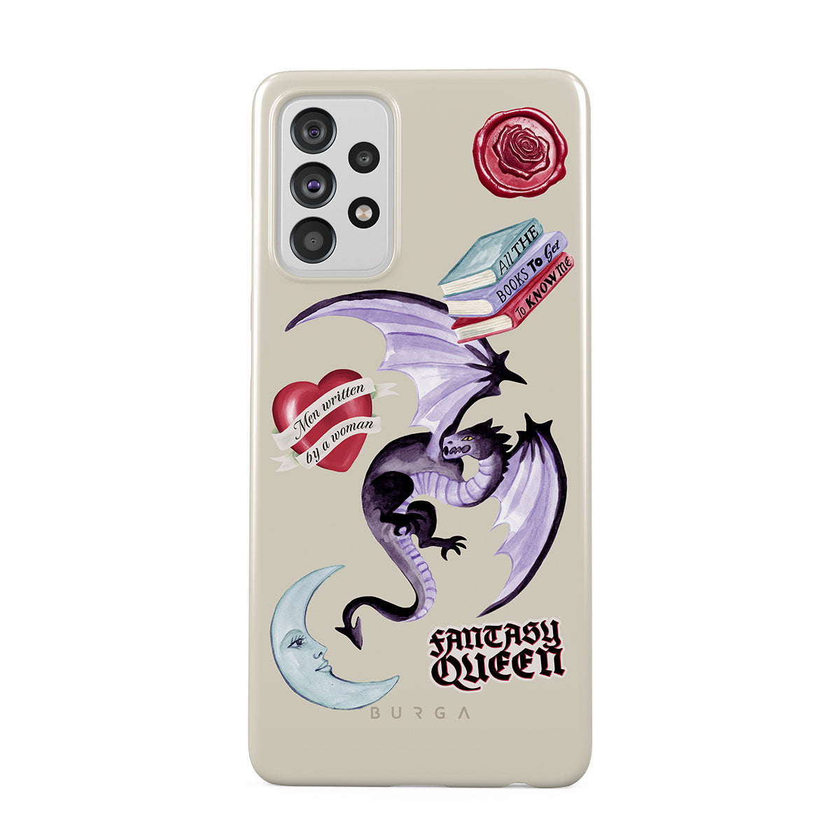 Typické pro tento motiv: fialového draka, samolepku „Fantasy Queen“, půlměsíc, fialovou pečeť, srdce se zprávou, knihy.