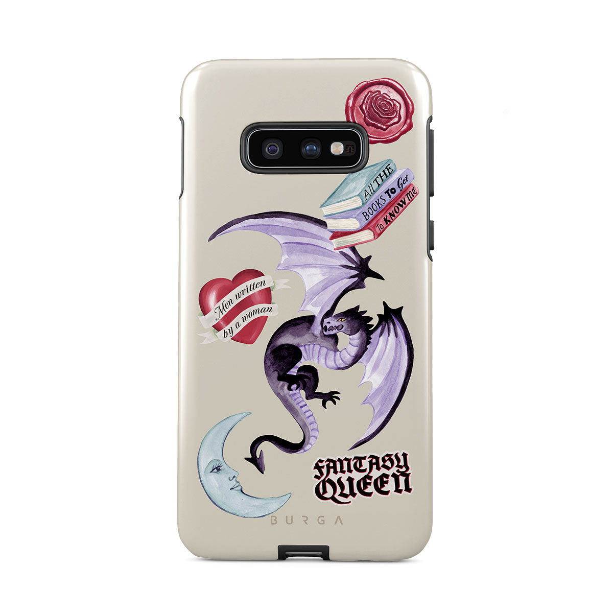 Typické pro tento motiv: fialového draka, samolepku „Fantasy Queen“, půlměsíc, fialovou pečeť, srdce se zprávou, knihy.