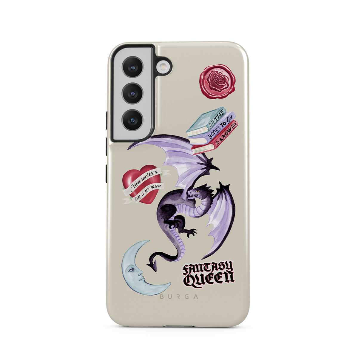 Typické pro tento motiv: fialového draka, samolepku „Fantasy Queen“, půlměsíc, fialovou pečeť, srdce se zprávou, knihy.