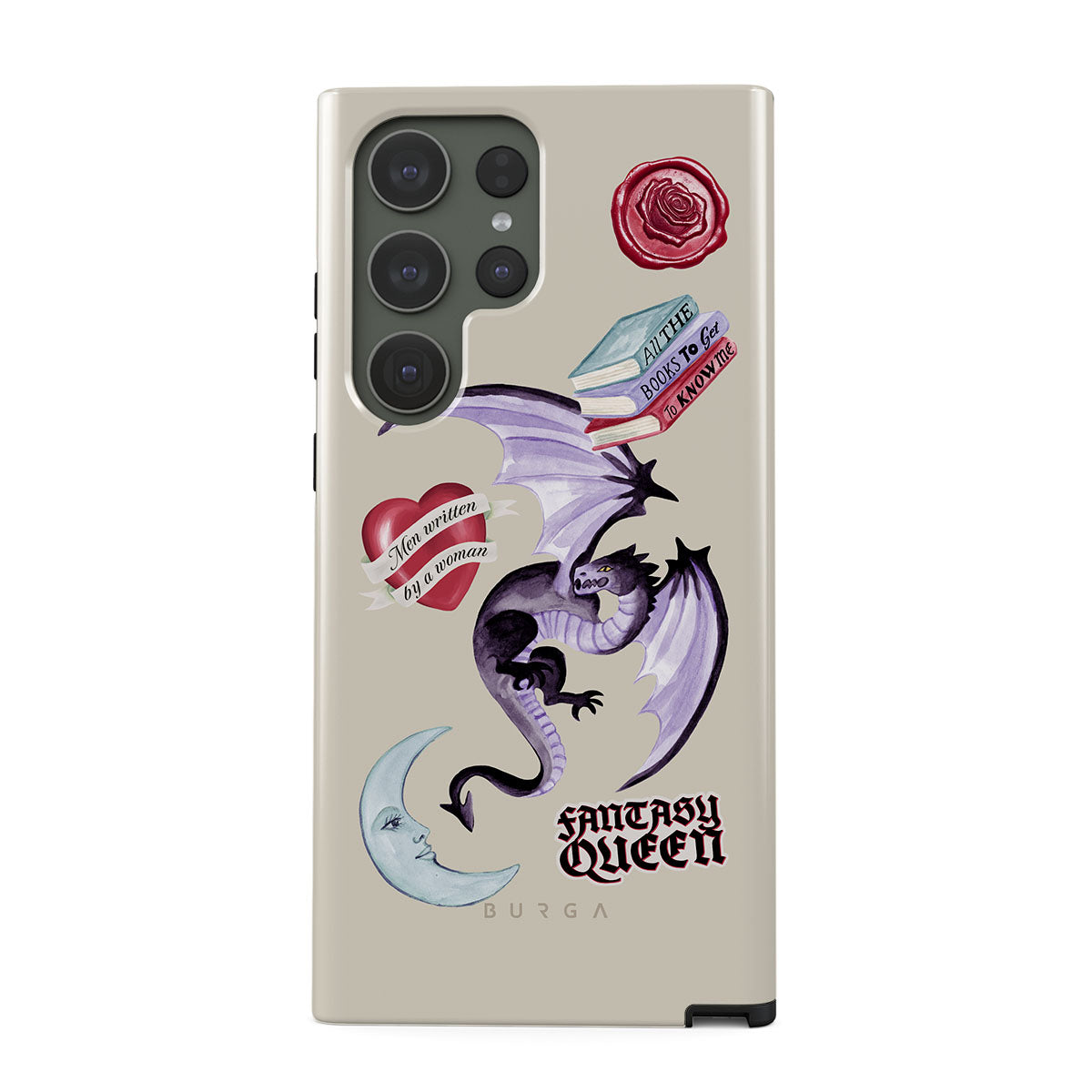 Typické pro tento motiv: fialového draka, samolepku „Fantasy Queen“, půlměsíc, fialovou pečeť, srdce se zprávou, knihy.