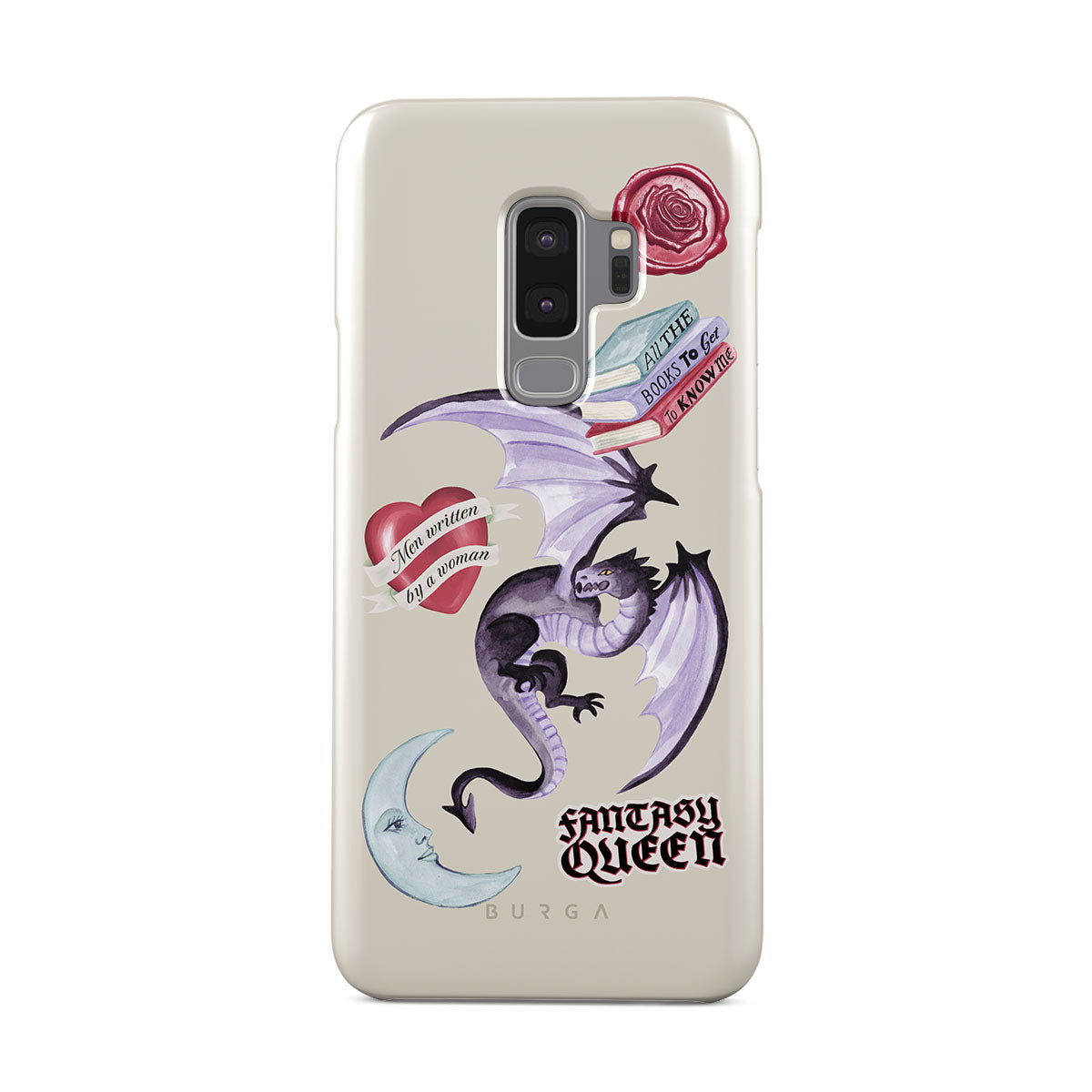 Typické pro tento motiv: fialového draka, samolepku „Fantasy Queen“, půlměsíc, fialovou pečeť, srdce se zprávou, knihy.