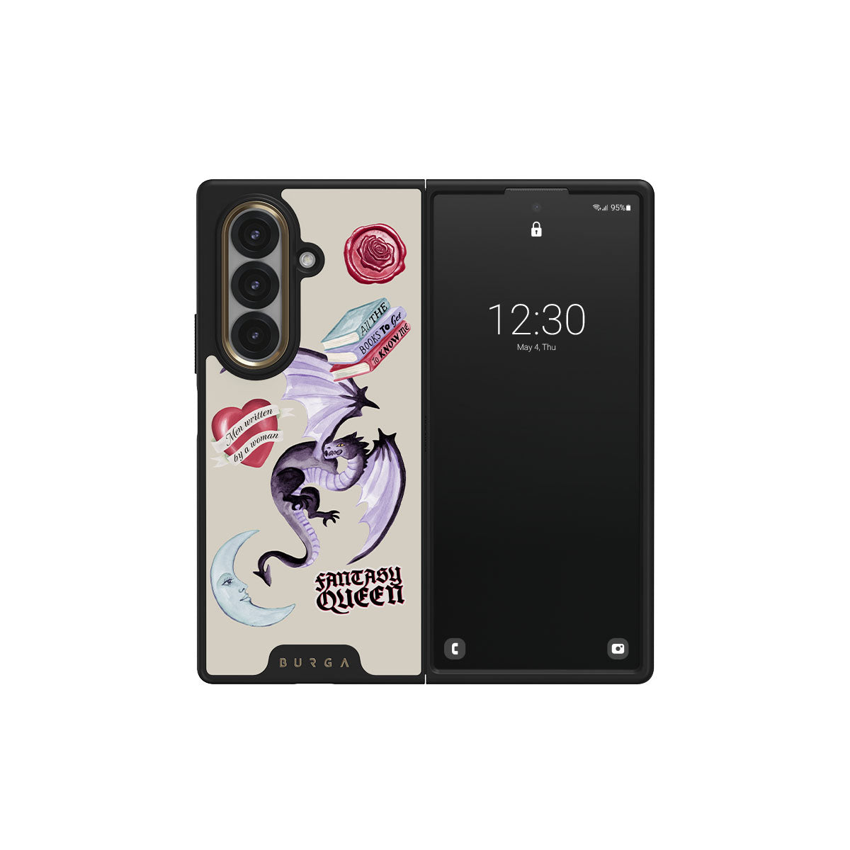 Typické pro tento motiv: fialového draka, samolepku „Fantasy Queen“, půlměsíc, fialovou pečeť, srdce se zprávou, knihy.