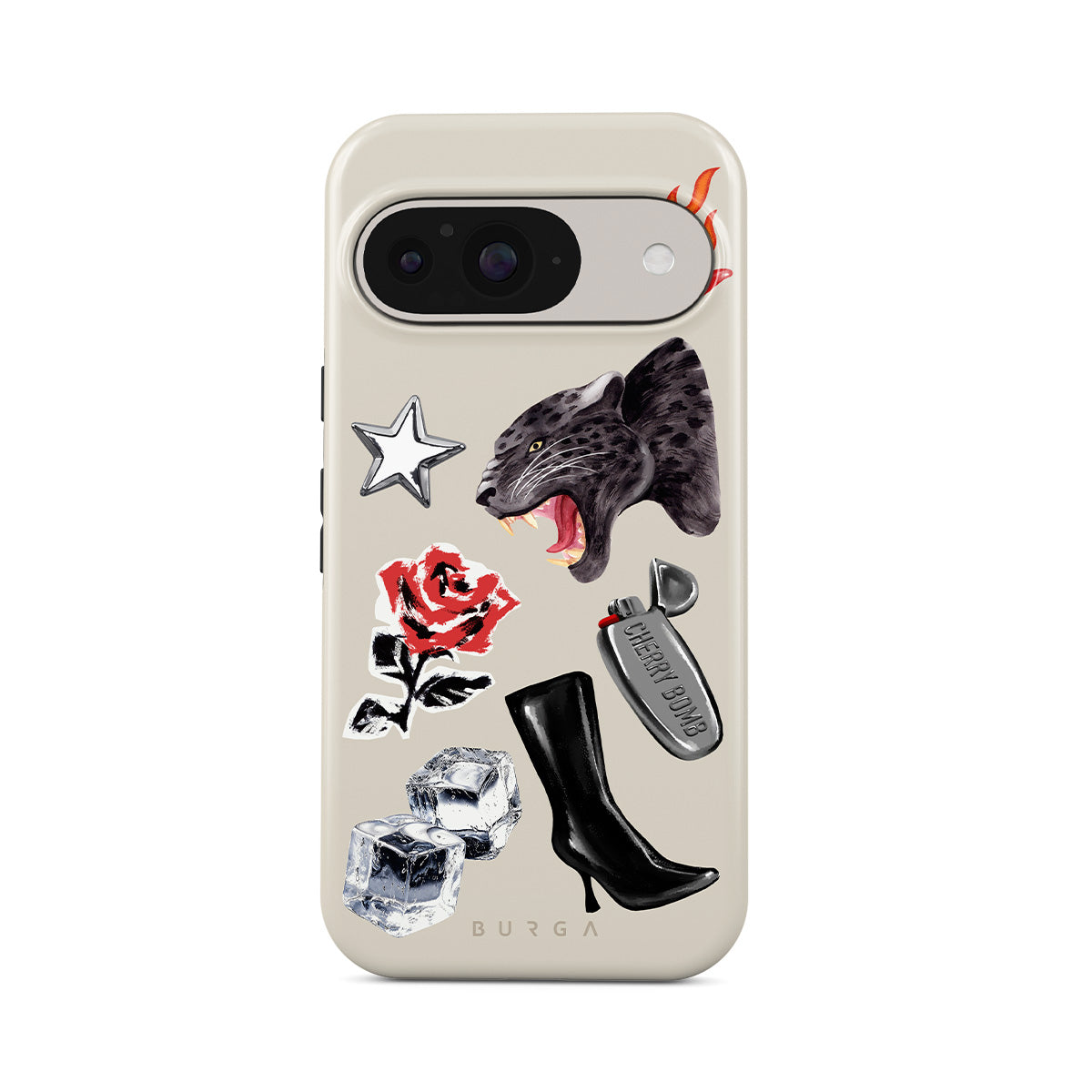 Typické pro tento motiv: černého pantera, červenou růži, hořící papriku, stříbrný zapalovač, vysoké černé boty, kostky ledu, stříbrnou hvězdu.
