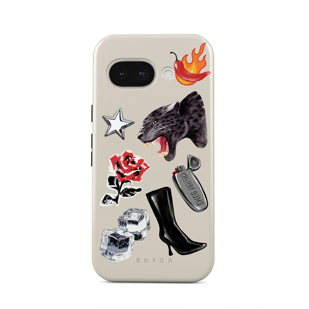 Typické pro tento motiv: černého pantera, červenou růži, hořící papriku, stříbrný zapalovač, vysoké černé boty, kostky ledu, stříbrnou hvězdu.