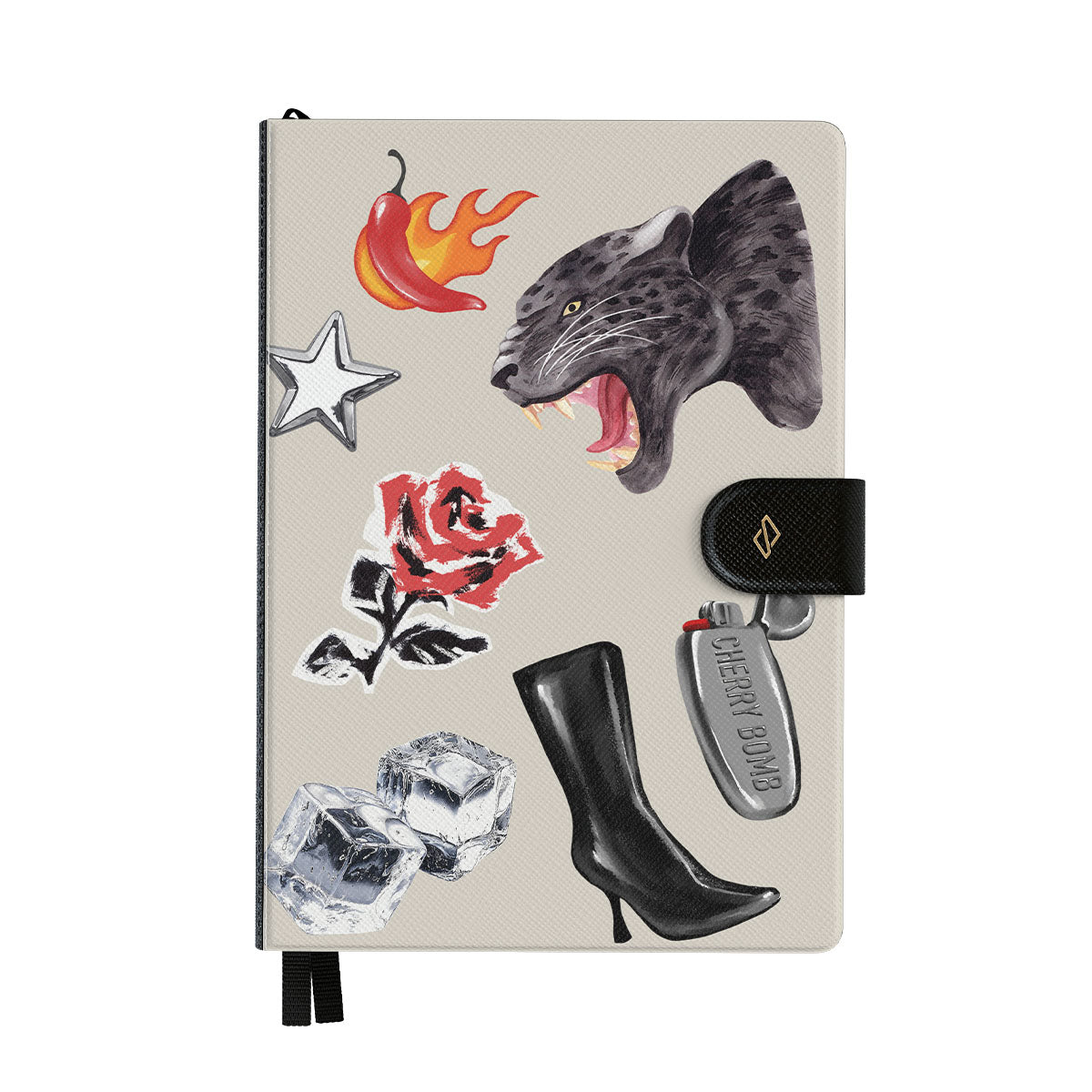 Typické pro tento motiv: černého pantera, červenou růži, hořící papriku, stříbrný zapalovač, vysoké černé boty, kostky ledu, stříbrnou hvězdu.