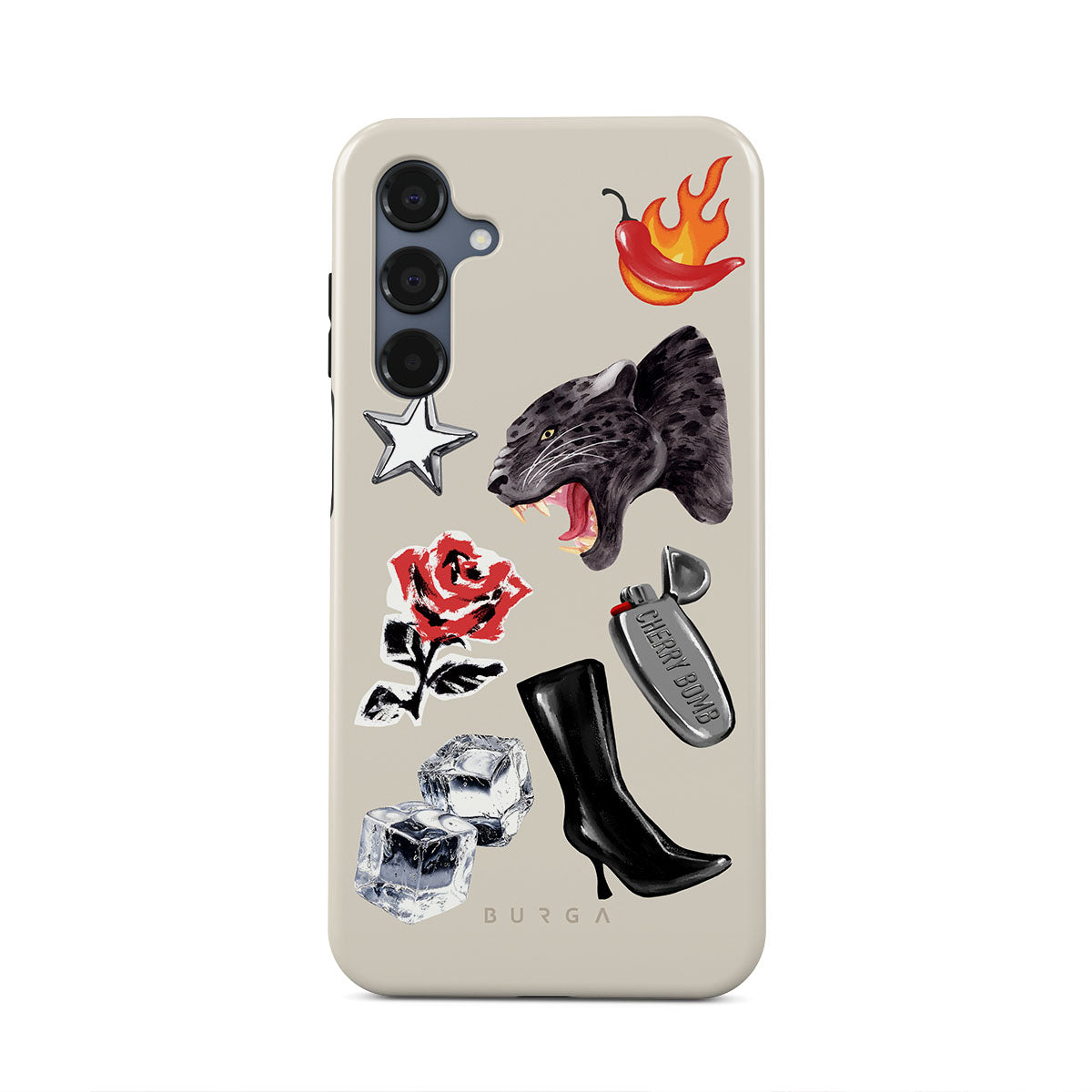 Typické pro tento motiv: černého pantera, červenou růži, hořící papriku, stříbrný zapalovač, vysoké černé boty, kostky ledu, stříbrnou hvězdu.
