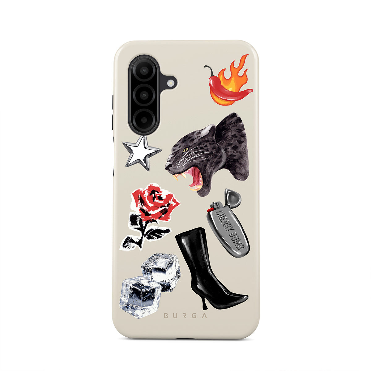 Typické pro tento motiv: černého pantera, červenou růži, hořící papriku, stříbrný zapalovač, vysoké černé boty, kostky ledu, stříbrnou hvězdu.