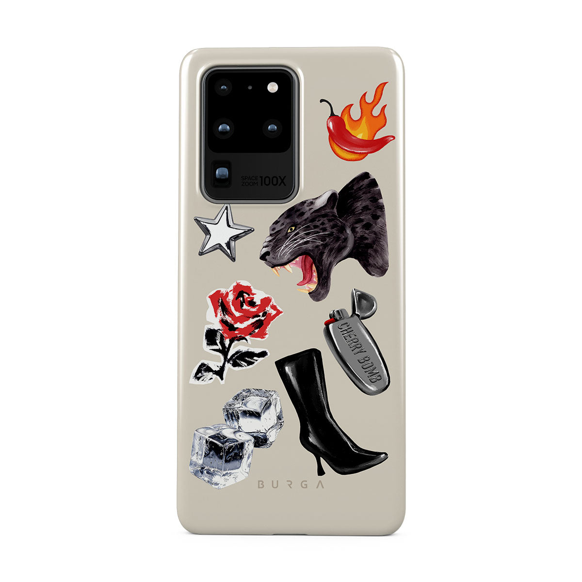 Typické pro tento motiv: černého pantera, červenou růži, hořící papriku, stříbrný zapalovač, vysoké černé boty, kostky ledu, stříbrnou hvězdu.