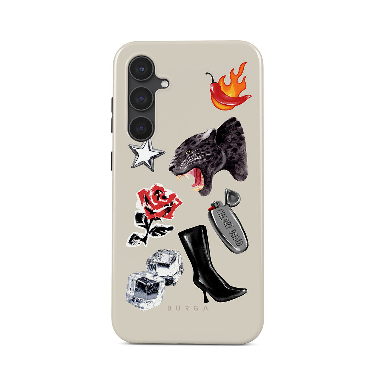 Typické pro tento motiv: černého pantera, červenou růži, hořící papriku, stříbrný zapalovač, vysoké černé boty, kostky ledu, stříbrnou hvězdu.