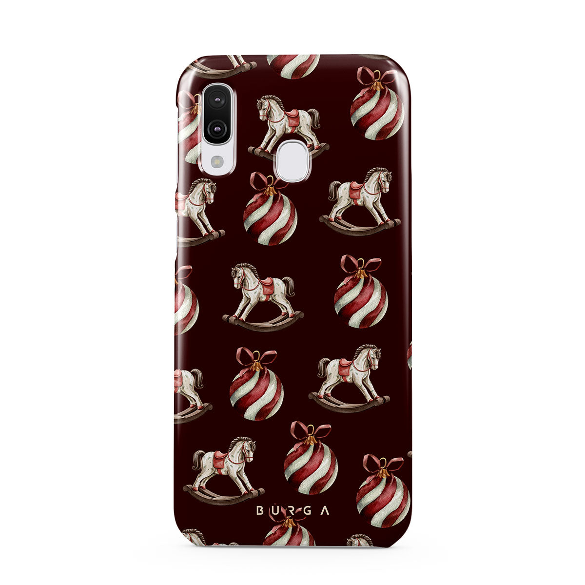 Typické pro tento motiv: houpací koně, baňky, červená, vánoční vzor