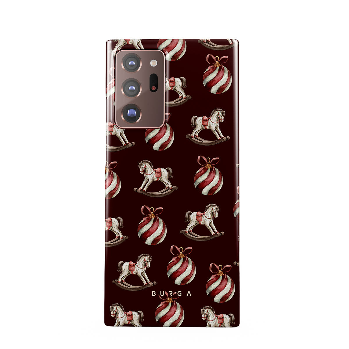 Typické pro tento motiv: houpací koně, baňky, červená, vánoční vzor