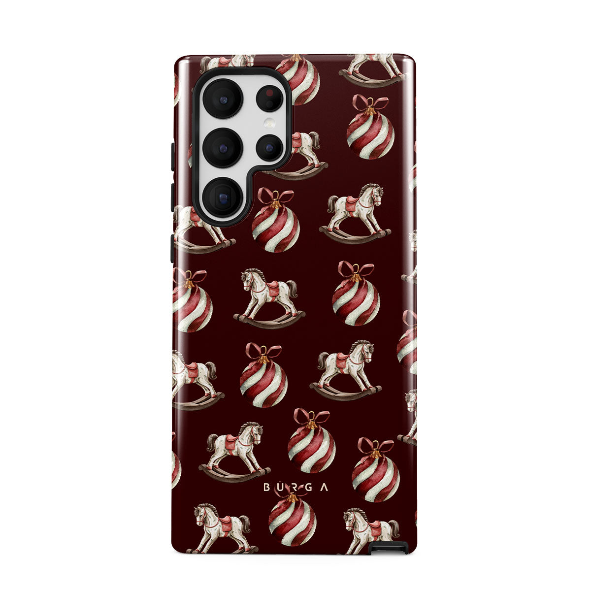 Typické pro tento motiv: houpací koně, baňky, červená, vánoční vzor