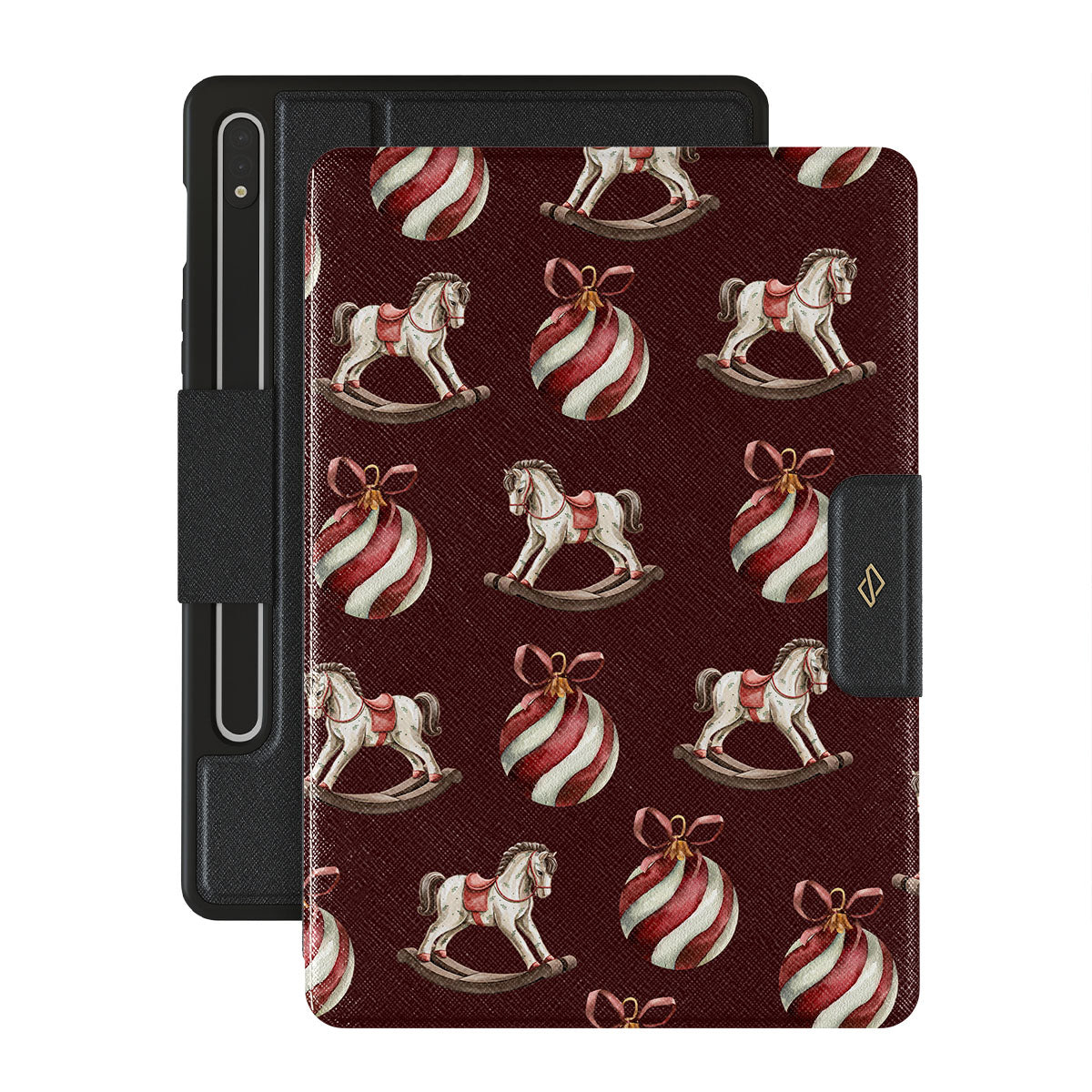 Typické pro tento motiv: houpací koně, baňky, červená, vánoční vzor
