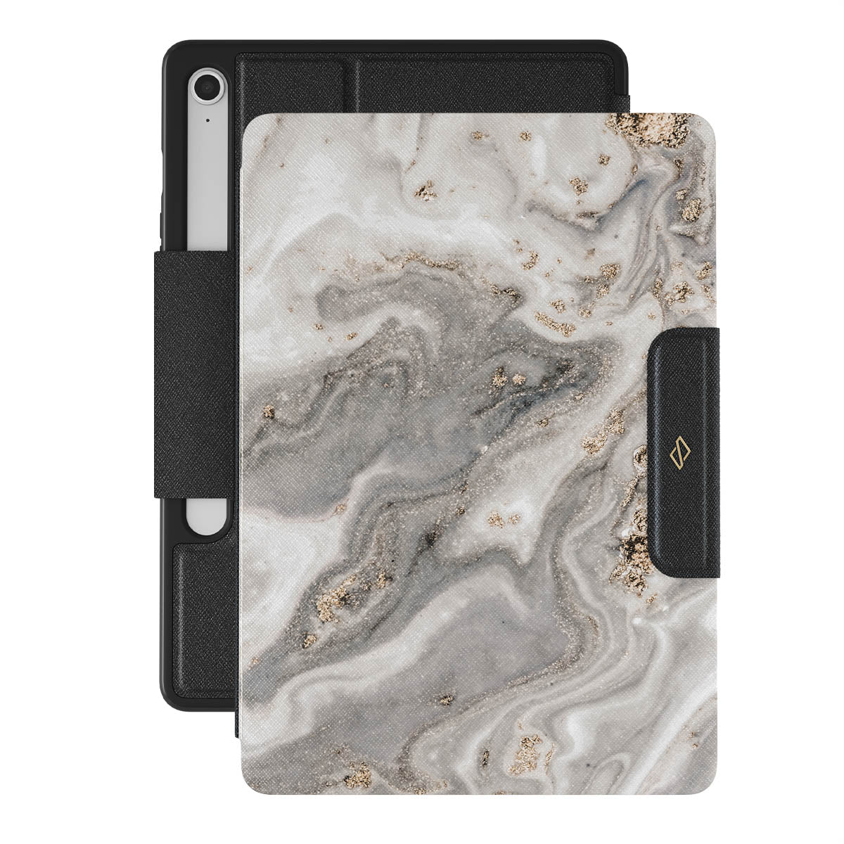 - Přední strana má magnet, který ji drží v uzavřené pozici.