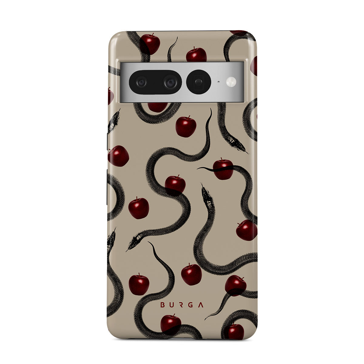 Tento motiv obsahuje: lesklá červená jablka, stočené hady, béžové tóny.