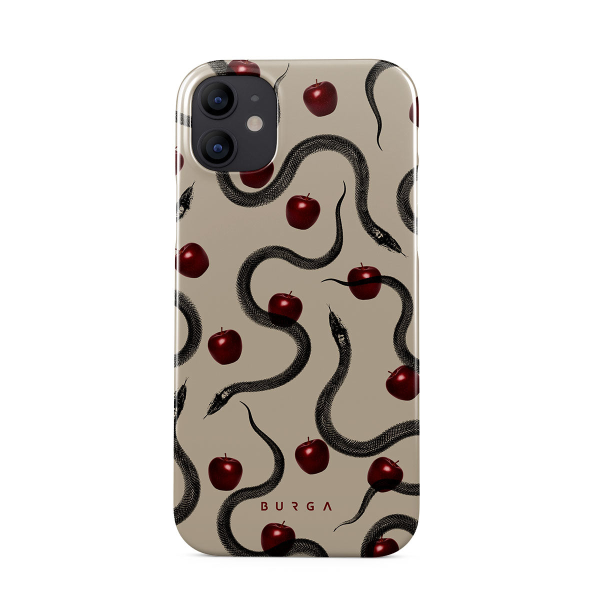 Tento motiv obsahuje: lesklá červená jablka, stočené hady, béžové tóny.
