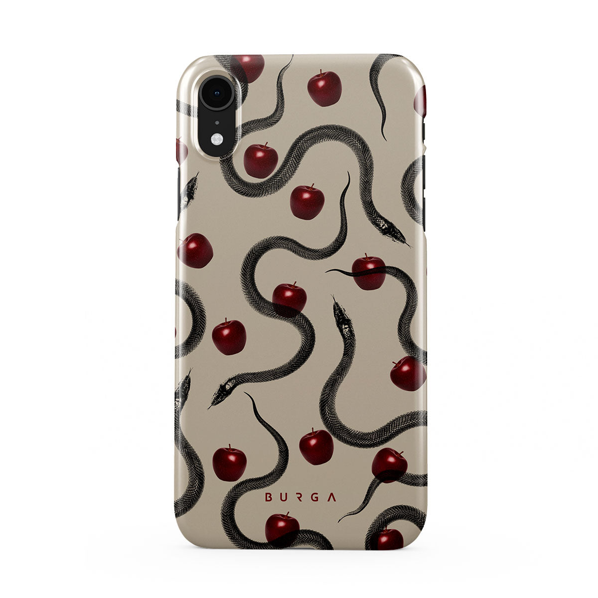 Tento motiv obsahuje: lesklá červená jablka, stočené hady, béžové tóny.