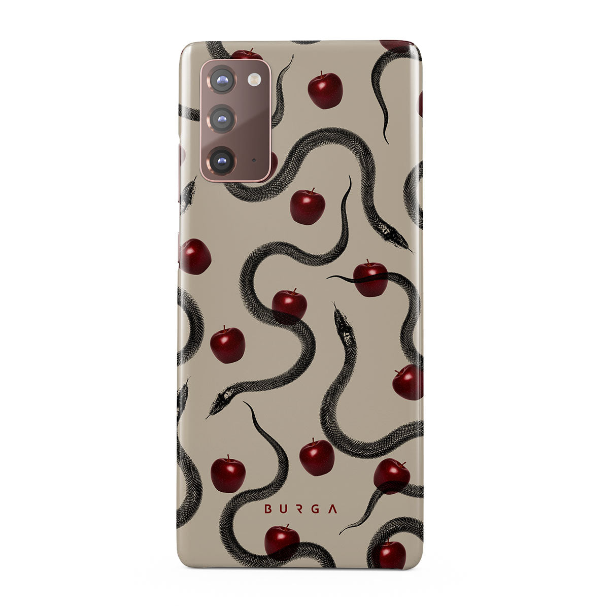 Tento motiv obsahuje: lesklá červená jablka, stočené hady, béžové tóny.