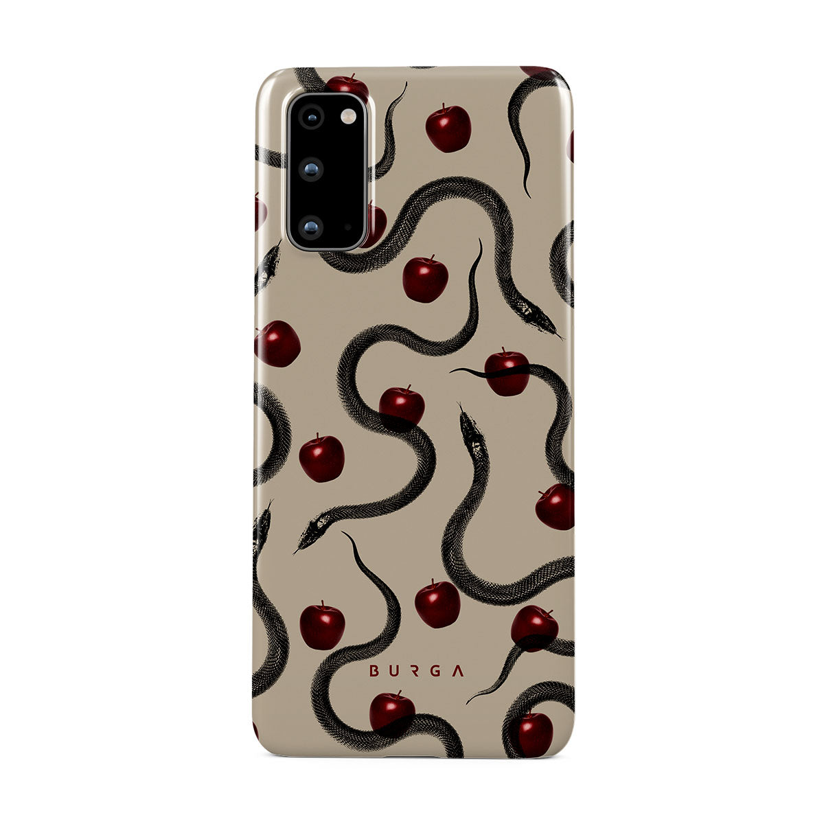 Tento motiv obsahuje: lesklá červená jablka, stočené hady, béžové tóny.