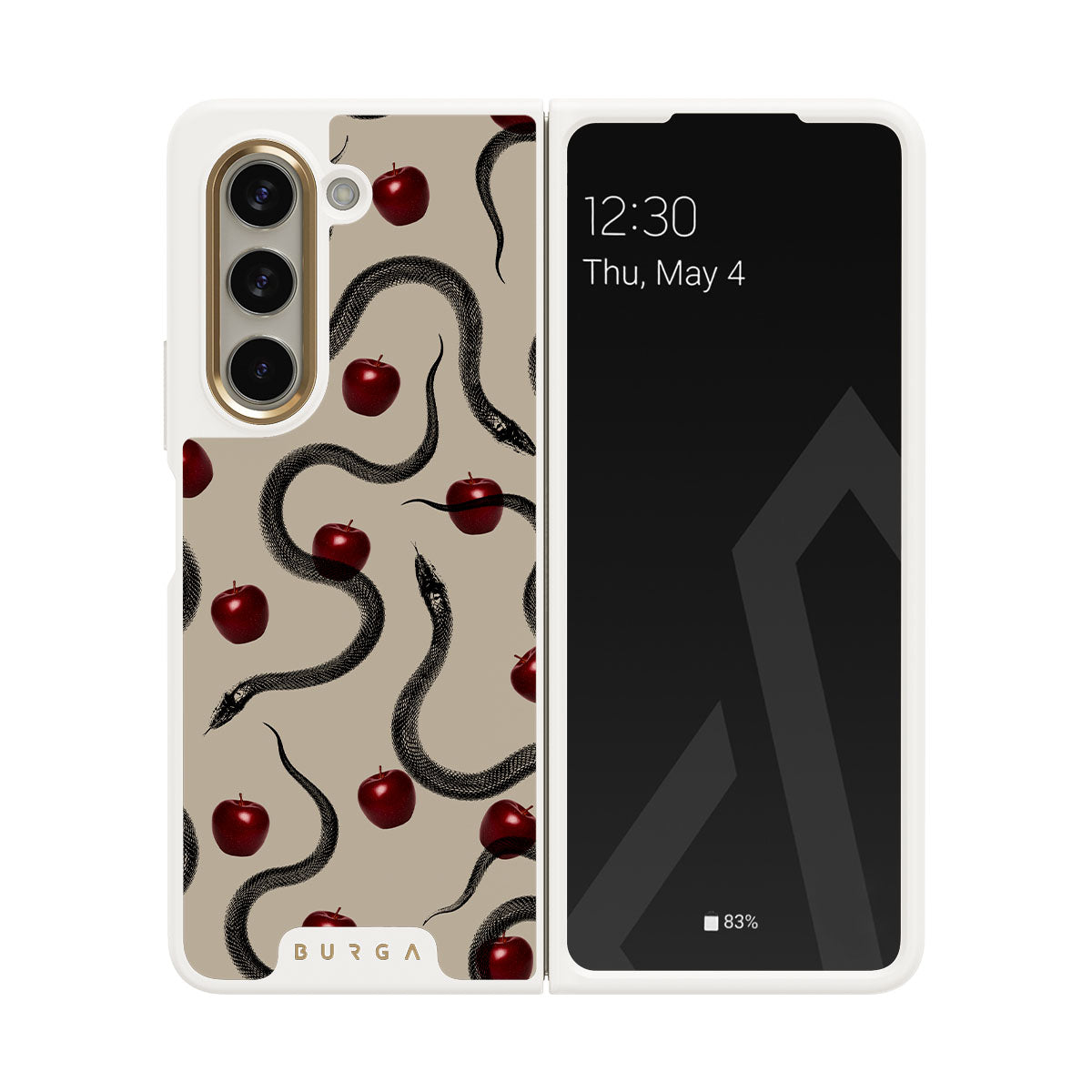 Tento motiv obsahuje: lesklá červená jablka, stočené hady, béžové tóny.