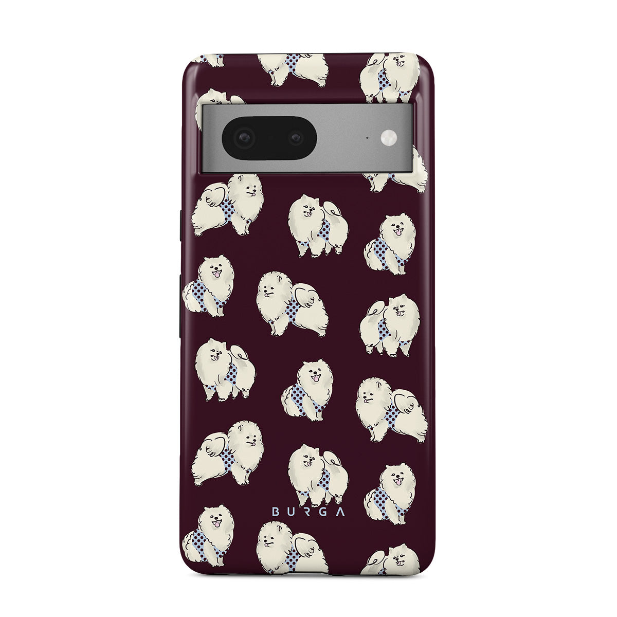 Typické pro tento motiv: bílé chlupaté psy na tmavě bordovém pozadí, pudly, domácí mazlíčky.