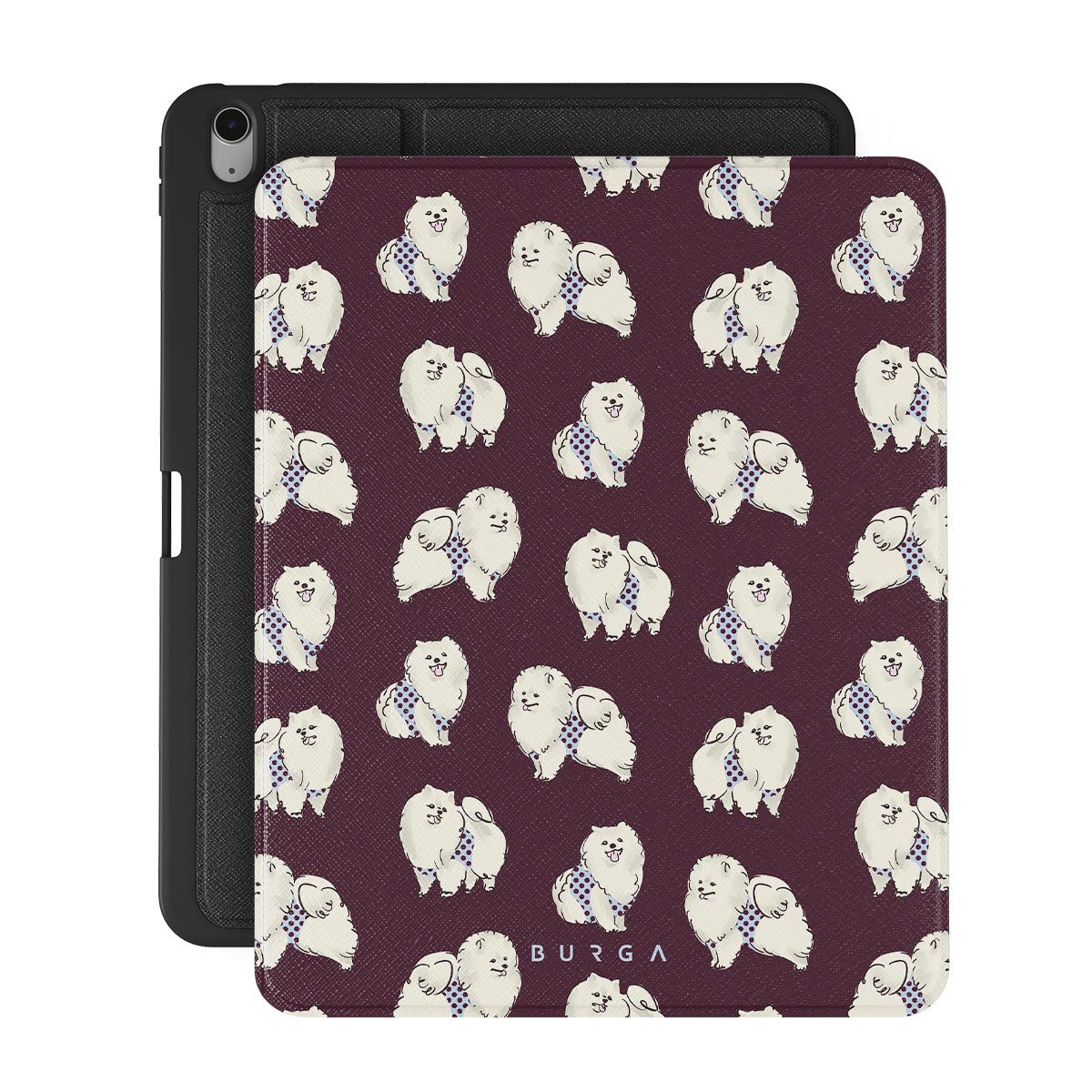 Typické pro tento motiv: bílé chlupaté psy na tmavě bordovém pozadí, pudly, domácí mazlíčky.