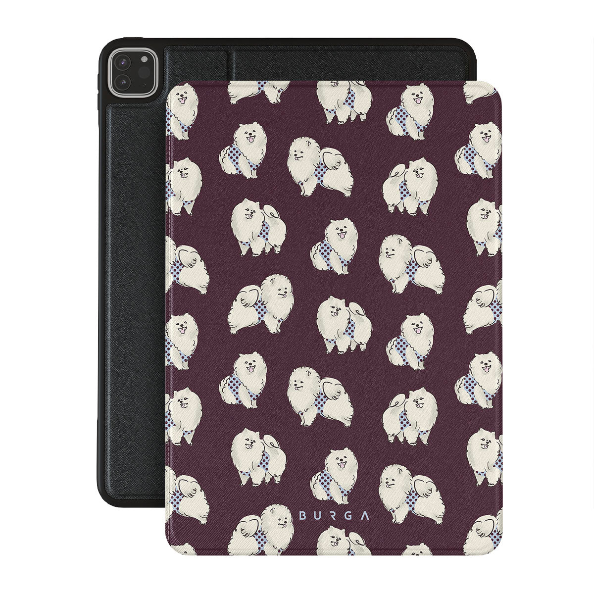 Typické pro tento motiv: bílé chlupaté psy na tmavě bordovém pozadí, pudly, domácí mazlíčky.