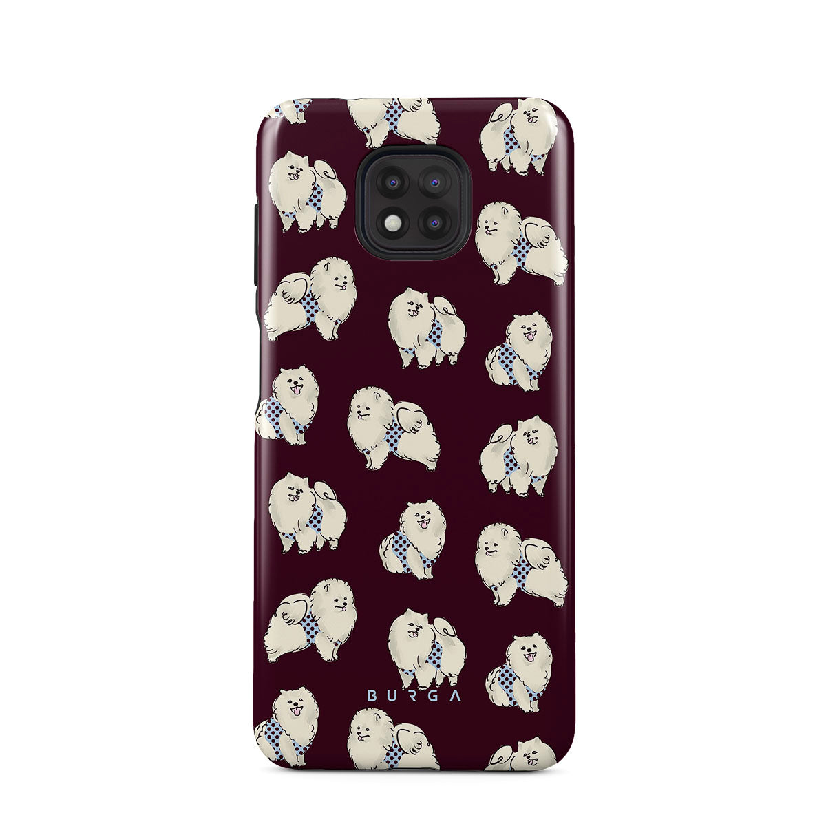 Typické pro tento motiv: bílé chlupaté psy na tmavě bordovém pozadí, pudly, domácí mazlíčky.