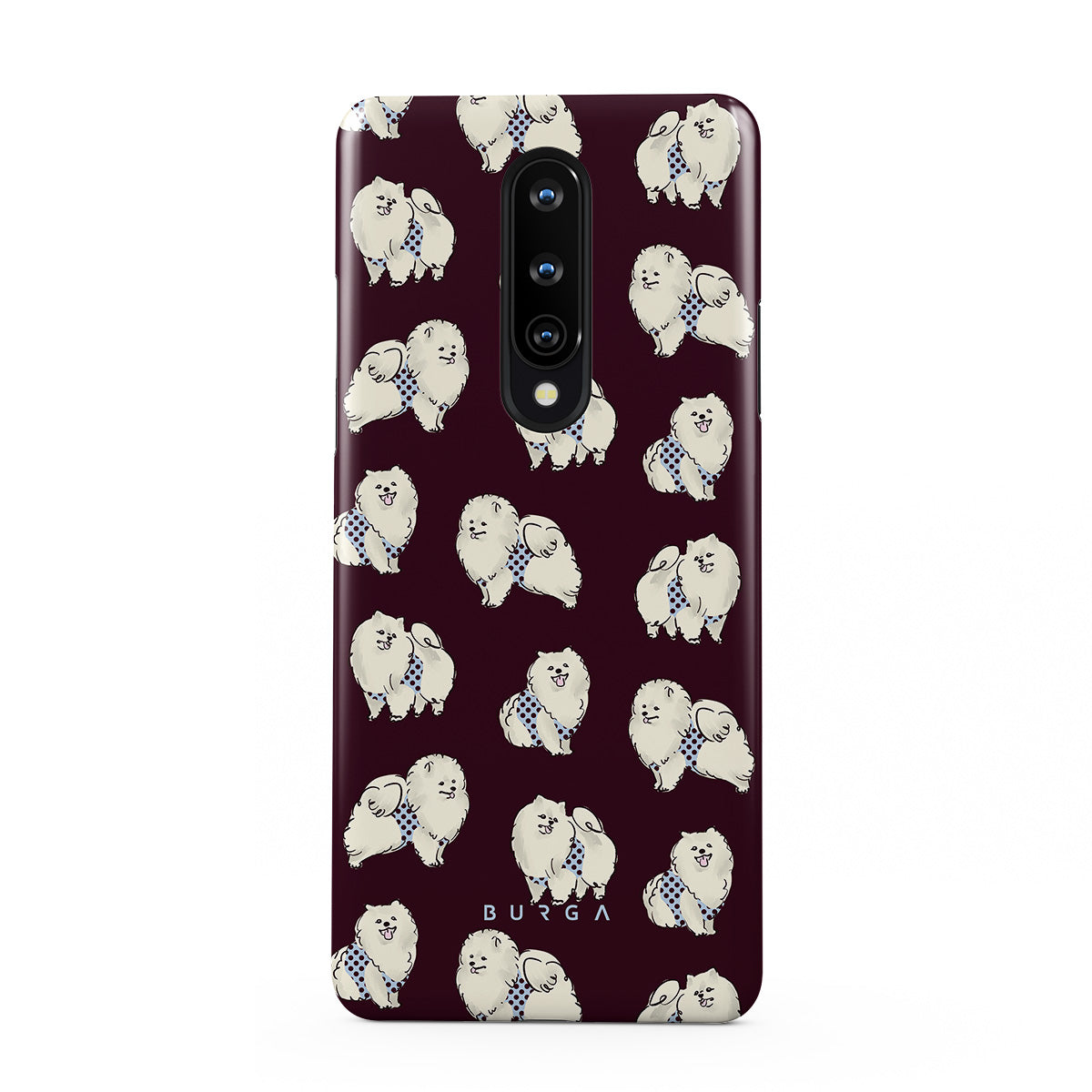 Typické pro tento motiv: bílé chlupaté psy na tmavě bordovém pozadí, pudly, domácí mazlíčky.