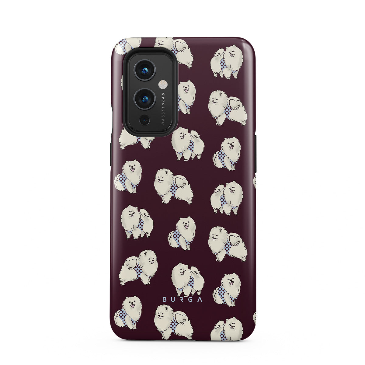 Typické pro tento motiv: bílé chlupaté psy na tmavě bordovém pozadí, pudly, domácí mazlíčky.