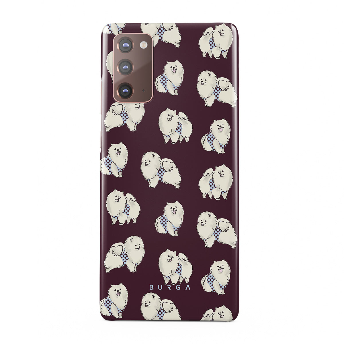 Typické pro tento motiv: bílé chlupaté psy na tmavě bordovém pozadí, pudly, domácí mazlíčky.