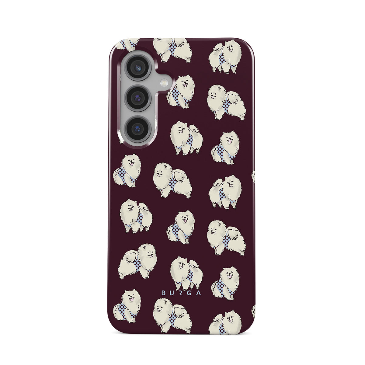 Typické pro tento motiv: bílé chlupaté psy na tmavě bordovém pozadí, pudly, domácí mazlíčky.