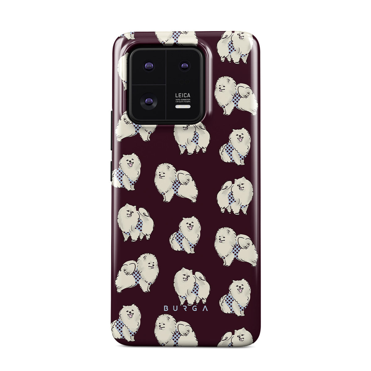 Typické pro tento motiv: bílé chlupaté psy na tmavě bordovém pozadí, pudly, domácí mazlíčky.