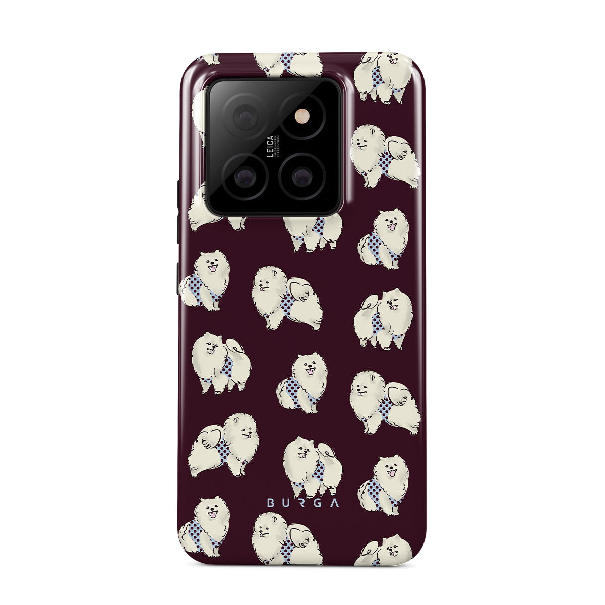 Typické pro tento motiv: bílé chlupaté psy na tmavě bordovém pozadí, pudly, domácí mazlíčky.