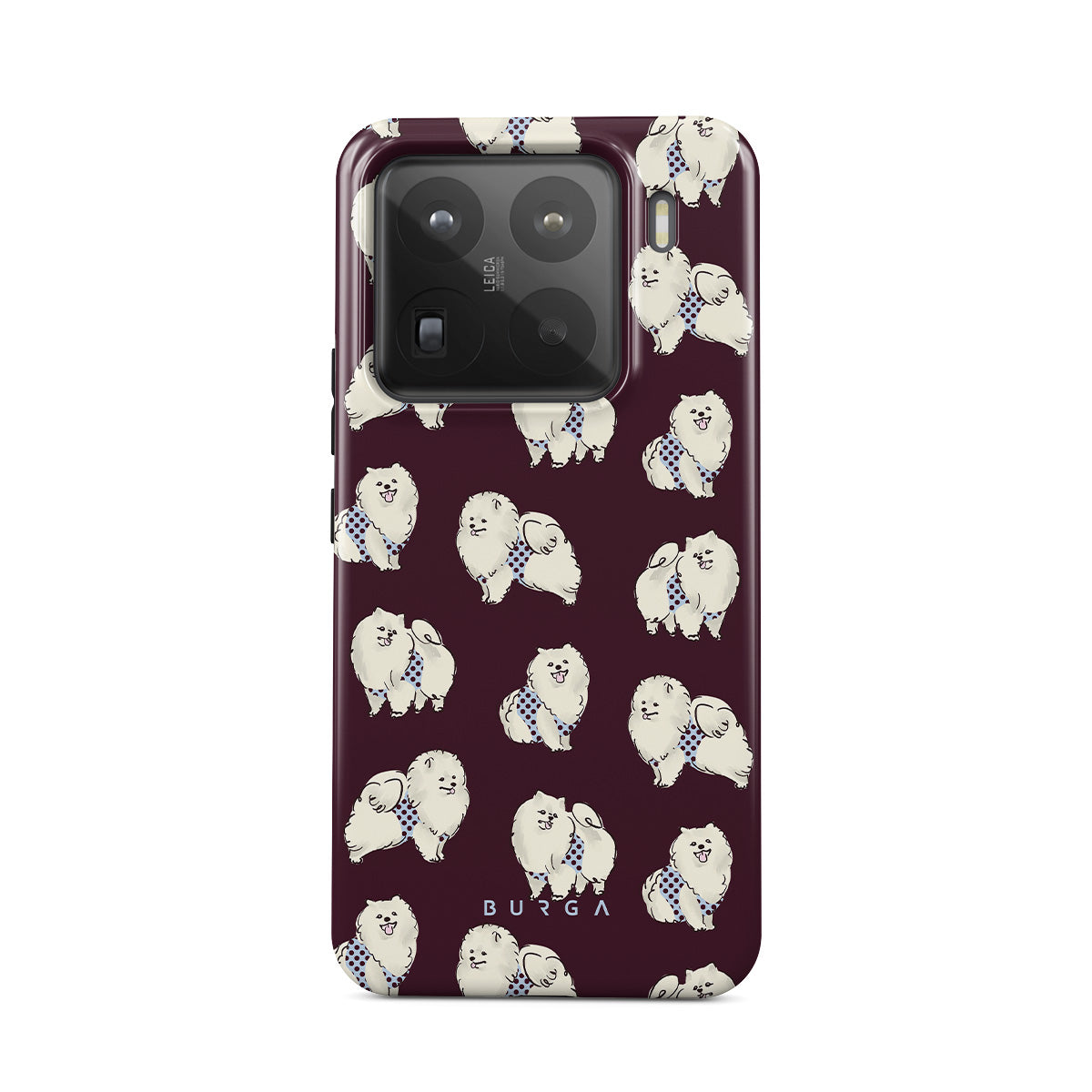 Typické pro tento motiv: bílé chlupaté psy na tmavě bordovém pozadí, pudly, domácí mazlíčky.