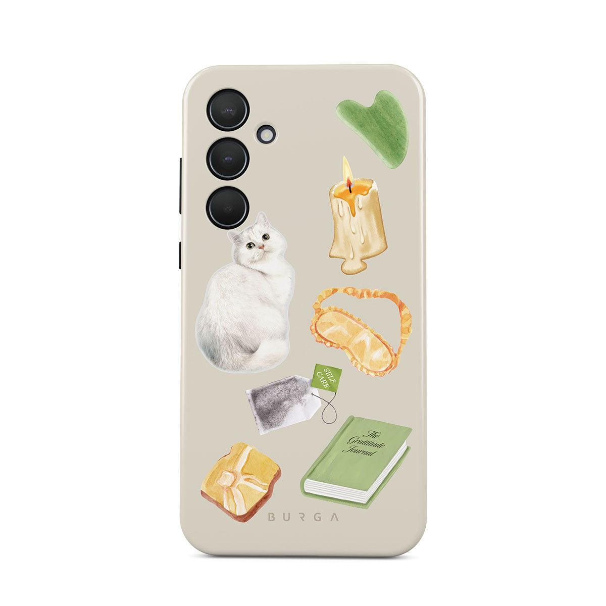 Typické pro tento motiv: bílou kočku, zelenou knihu, svíčku, Gua Sha tyčinku, masku na spaní, čajový sáček, žlutý krystal.