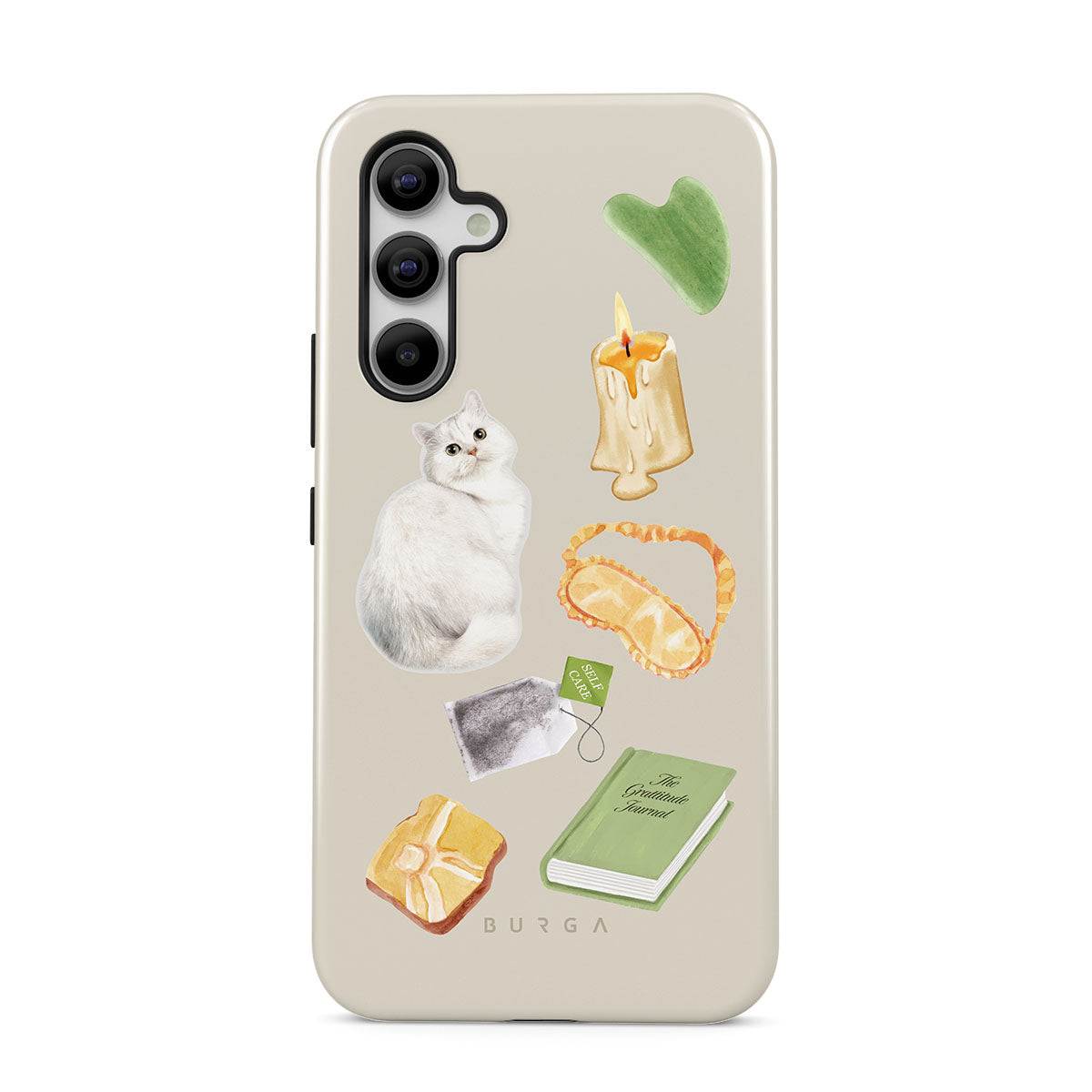 Typické pro tento motiv: bílou kočku, zelenou knihu, svíčku, Gua Sha tyčinku, masku na spaní, čajový sáček, žlutý krystal.