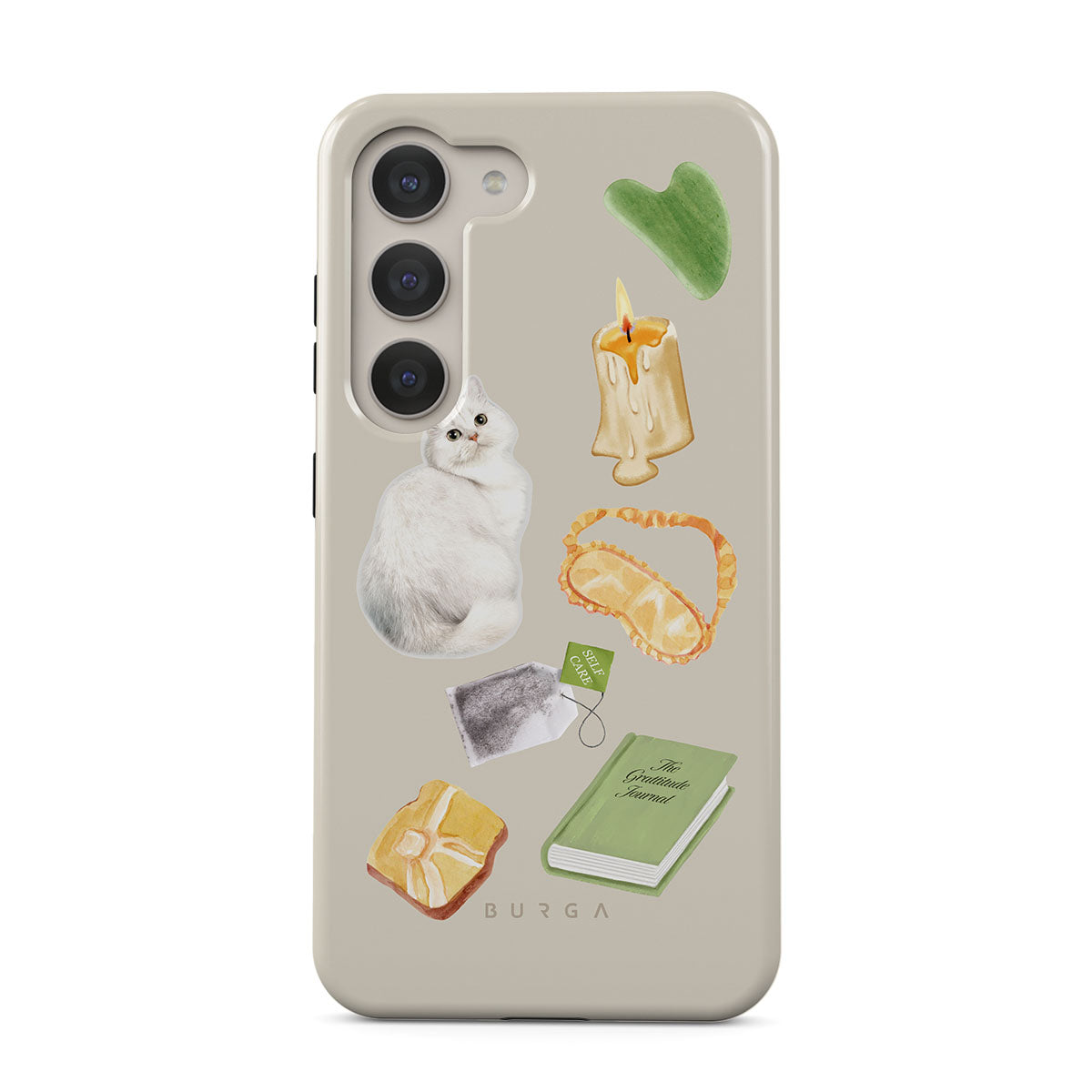 Typické pro tento motiv: bílou kočku, zelenou knihu, svíčku, Gua Sha tyčinku, masku na spaní, čajový sáček, žlutý krystal.