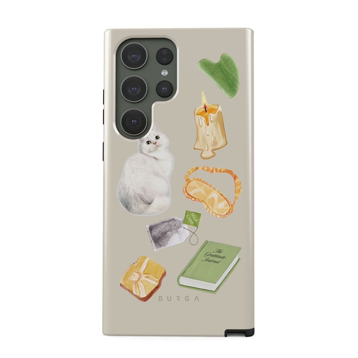 Typické pro tento motiv: bílou kočku, zelenou knihu, svíčku, Gua Sha tyčinku, masku na spaní, čajový sáček, žlutý krystal.
