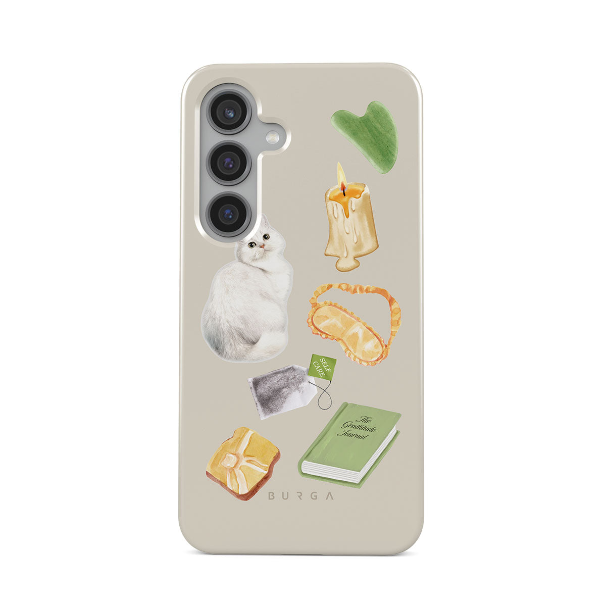 Typické pro tento motiv: bílou kočku, zelenou knihu, svíčku, Gua Sha tyčinku, masku na spaní, čajový sáček, žlutý krystal.